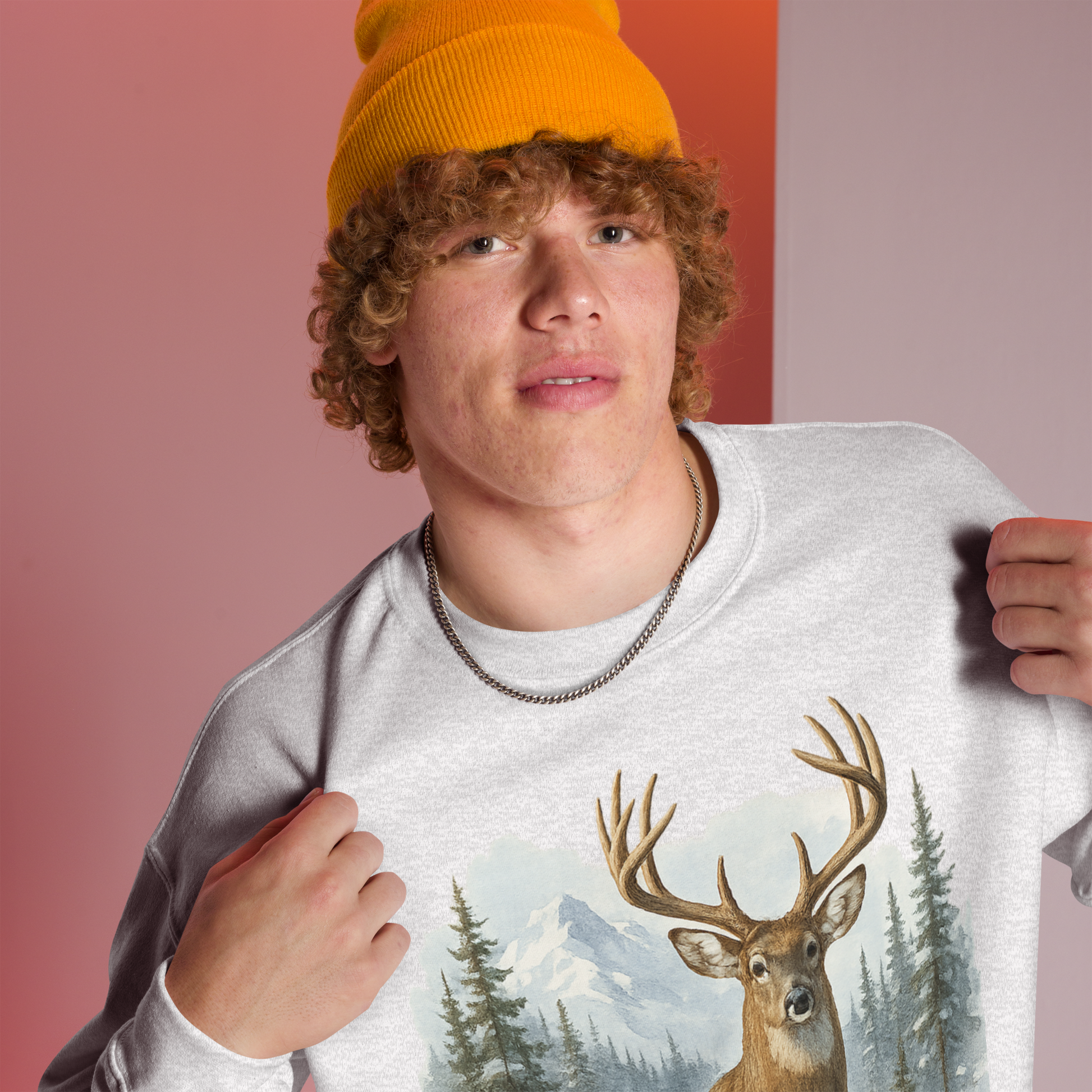 This crewneck is basically a winter postcard you can wear. The white-tailed buck graphic lands somewhere between majestic and quietly badass, like it just stepped out of the woods and onto your sweatshirt. The fabric is a cozy cotton-poly blend with a soft, brushed inside that holds up to regular wear without shrinking. Classic fit, ribbed cuffs, and stitching built to last. Easy to throw on, easy to live in.